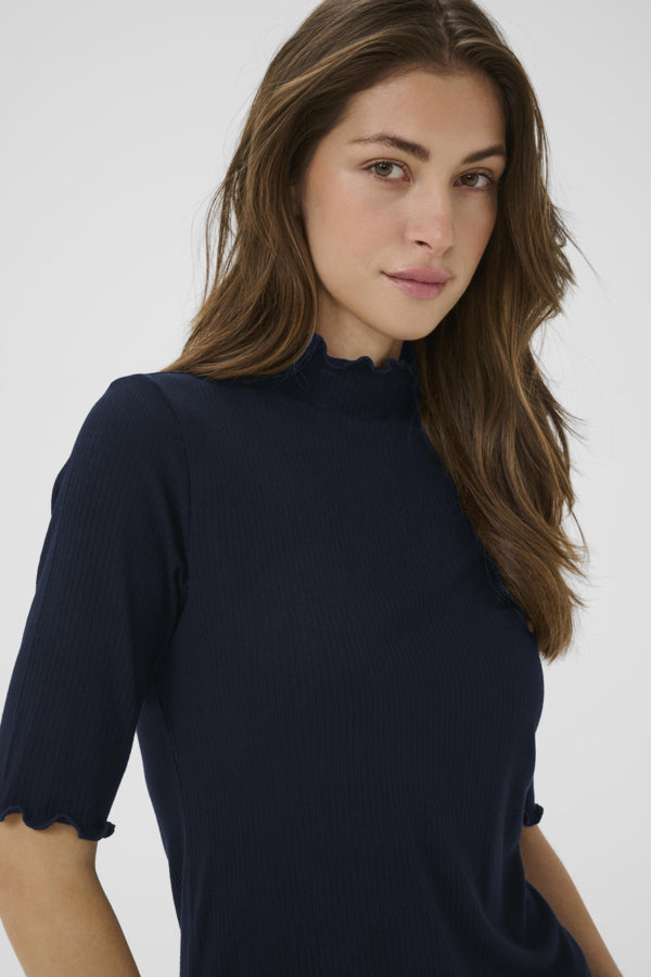 Denne tettsittende ribbestrikkede toppen har høy hals med volangkant og halvlange ermer. Elastisk materiale gir komfort og allsidighet til hverdagsbruk.