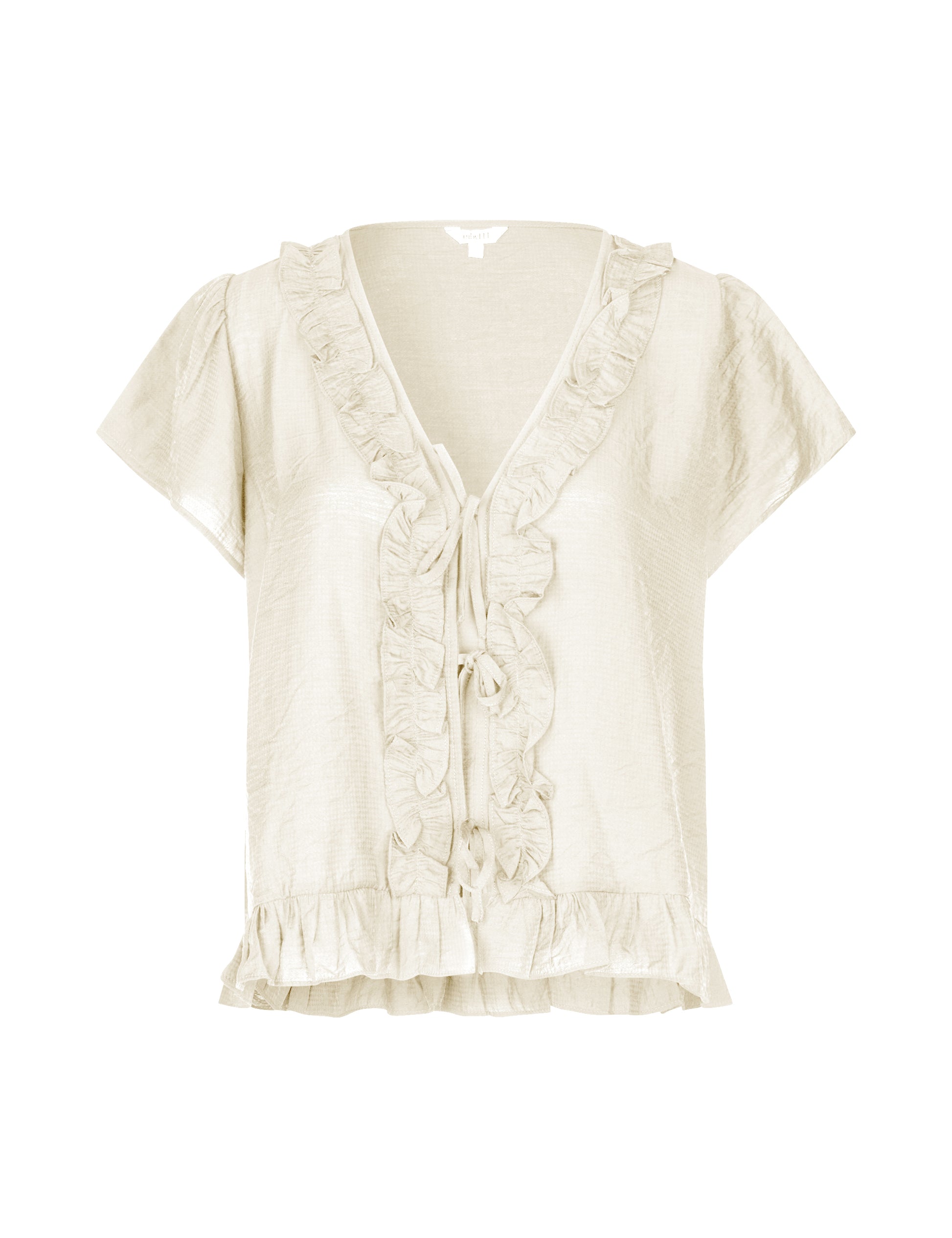 Bluse med flotte detaljer. Lukkes med knyting foran.